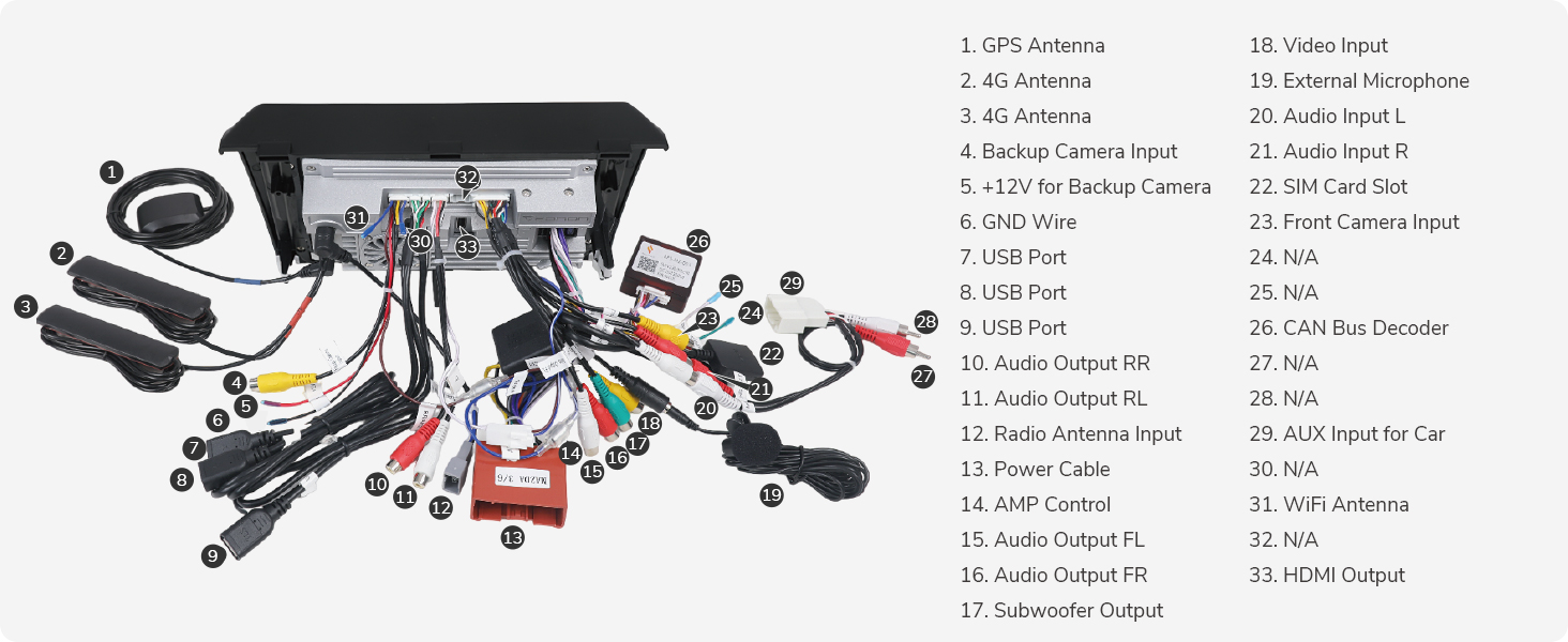• There are many audio out RCA ports (ie 10, 11, 15, and 16), but at the end of the day, the sound is either coming out of the head unit from 20 and 21 (ie. the aux), or what is labeled 13 (Power cable”, since if you see the pin mappings, there are audio labels there… or maybe it just controls how much power goes to each speaker in the car)